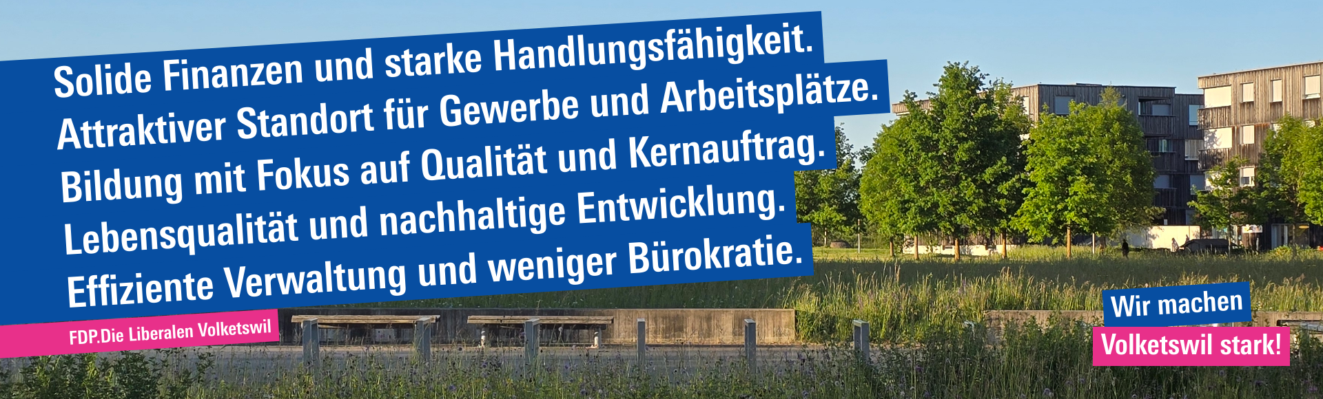 Volketswil ist eine dynamische Gemeinde geprägt von Wachstum, Vielfalt und Nähe zu wichtigen Wirtschaftsstandorten. Damit Volketswil auch in Zukunft attraktiv bleibt, setzen wir uns für eine lösungsorientierte, bürgerliche und liberale Politik ein. Unser Handeln basiert auf Freiheit, Eigenverantwortung und einem Staat, der effizient und zielgerichtet arbeitet.